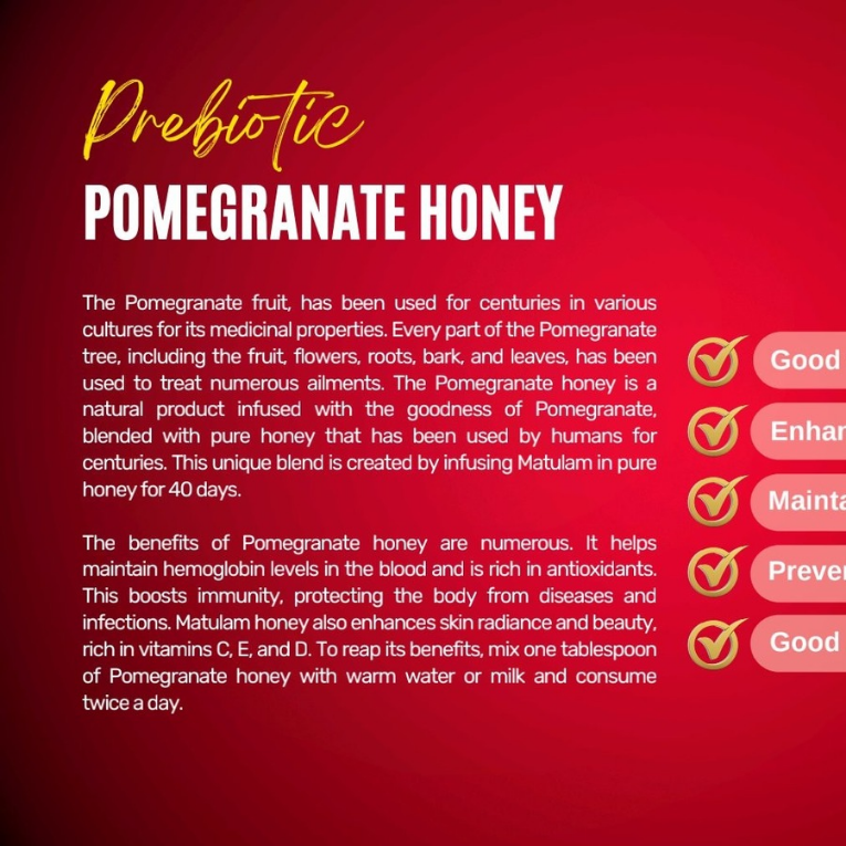 The fruits, flowers, roots, bark and leaves of this plant are used as medicine for many diseases. Pomegranate Honey is a natural product that has b